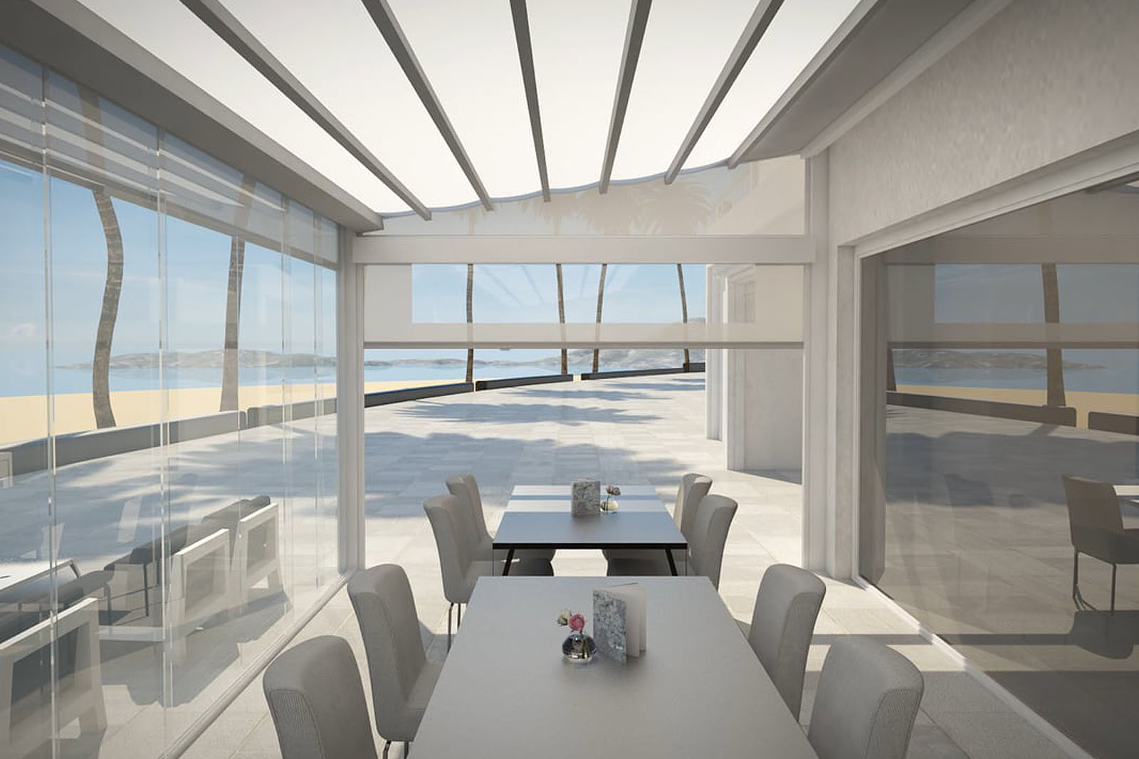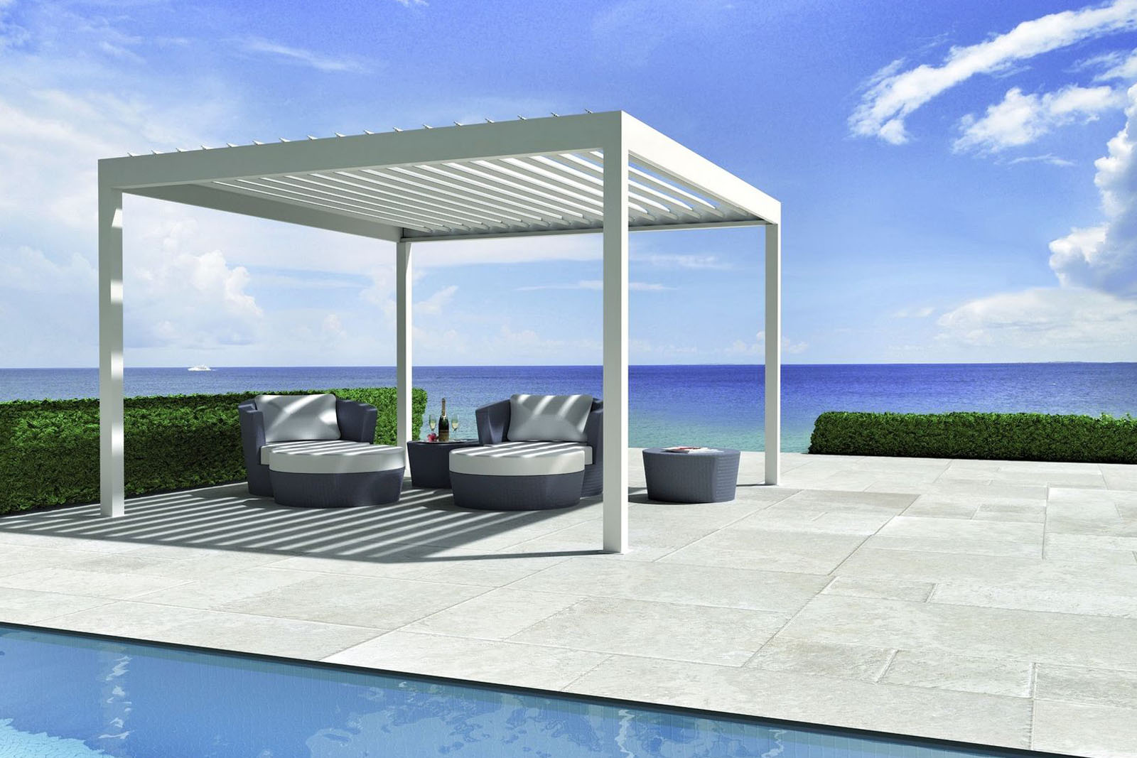 Durch Schließen der Seiten und Vorderseiten durch bewegliche Elemente wird der Komfort erhöht und der Kontakt zur Umgebung bleibt erhalten. Lammellendächer sind der perfekte Sonnen-, Regen– und Windschutz vereint in einem stylischen System.